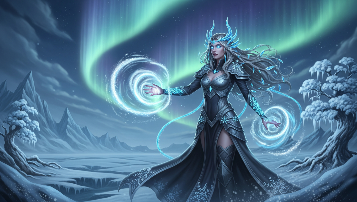 Tales tell of Vaelianne’s birth amid the icy heights of Eldrath, a realm locked in eternal winter beneath skies aglow with ghostly auroras. Raised by a lineage of elemental magic guardians, she was taught from an early age to master Frostweave—the rare craft of molding snow and ice into living forms.